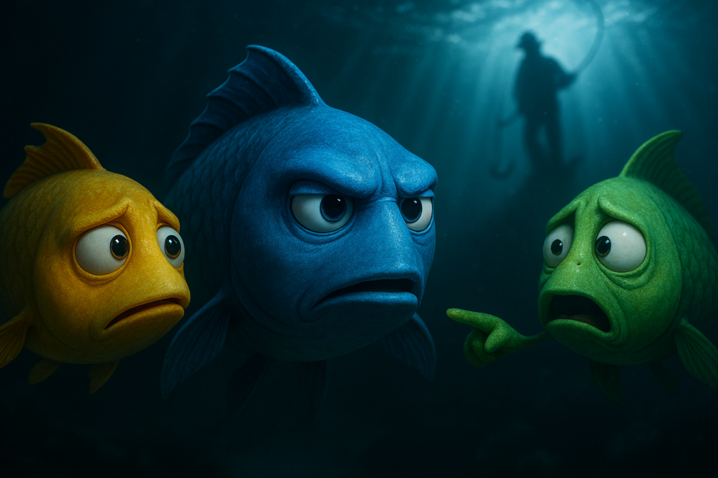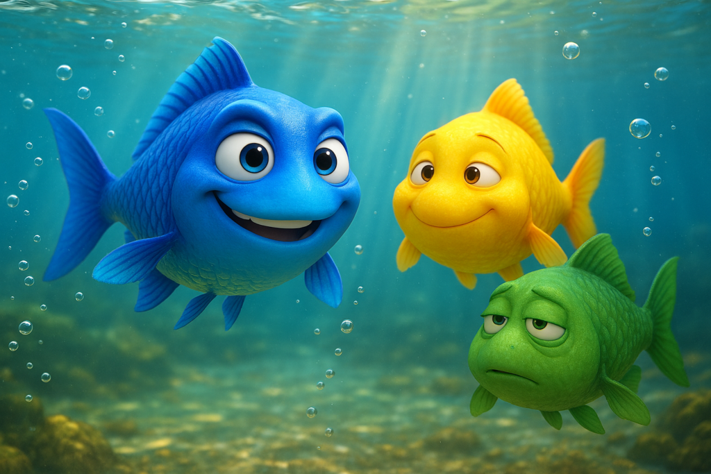 तीनों मछलियाँ अच्छी दोस्त थीं, लेकिन उनकी सोच अलग-अलग थी।