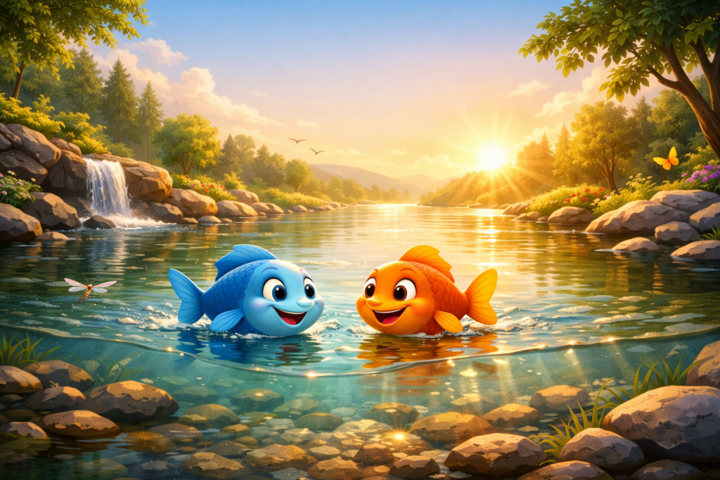 बहुत समय पहले, एक शांत और सुंदर तालाब था। उस तालाब में तीन मछलियाँ रहती थीं।