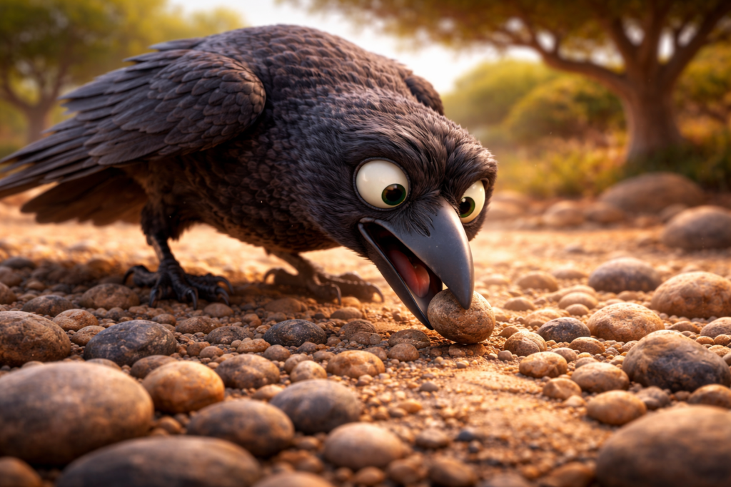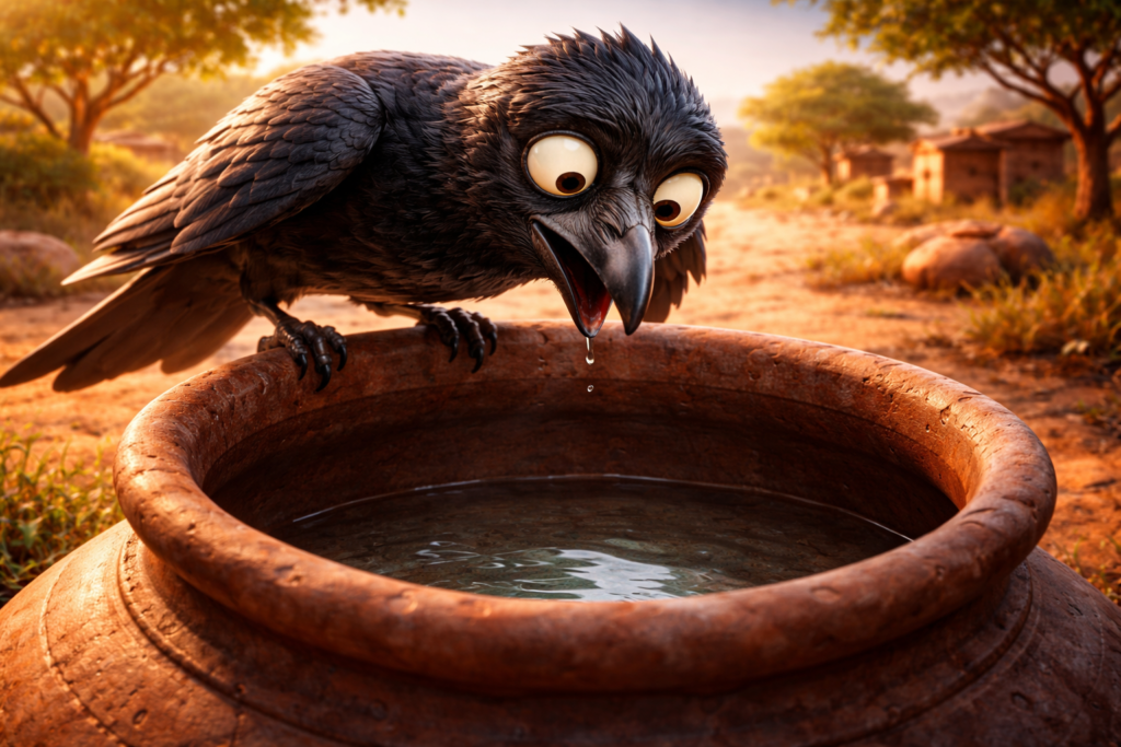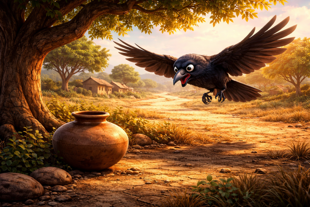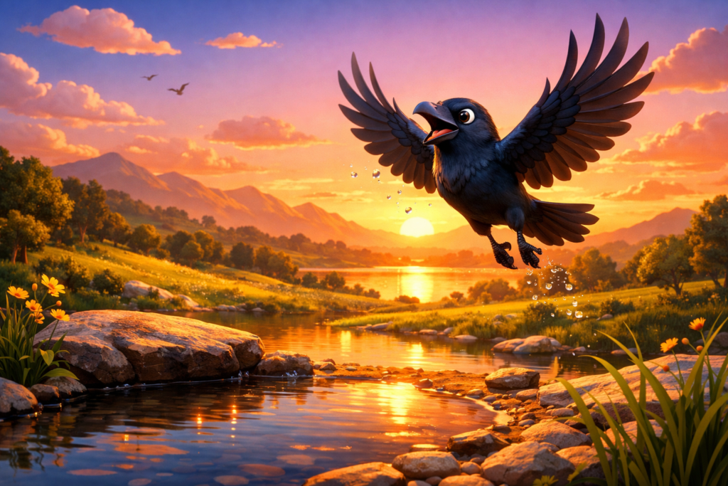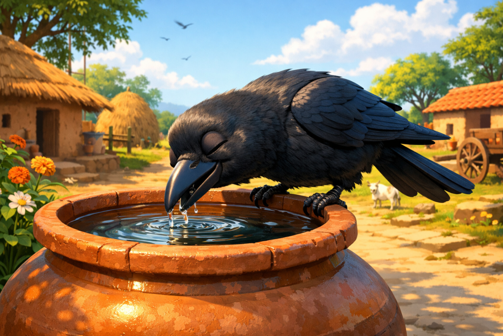 The story of the Wise Crow originates from Aesop’s Fables, a collection of moral stories from ancient Greece. In this tale, a thirsty crow discovers a pitcher with a small amount of water at the bottom. The crow cannot reach the water with its beak, no matter how hard it tries. Instead of giving up, the clever bird begins dropping small pebbles into the pitcher one by one.