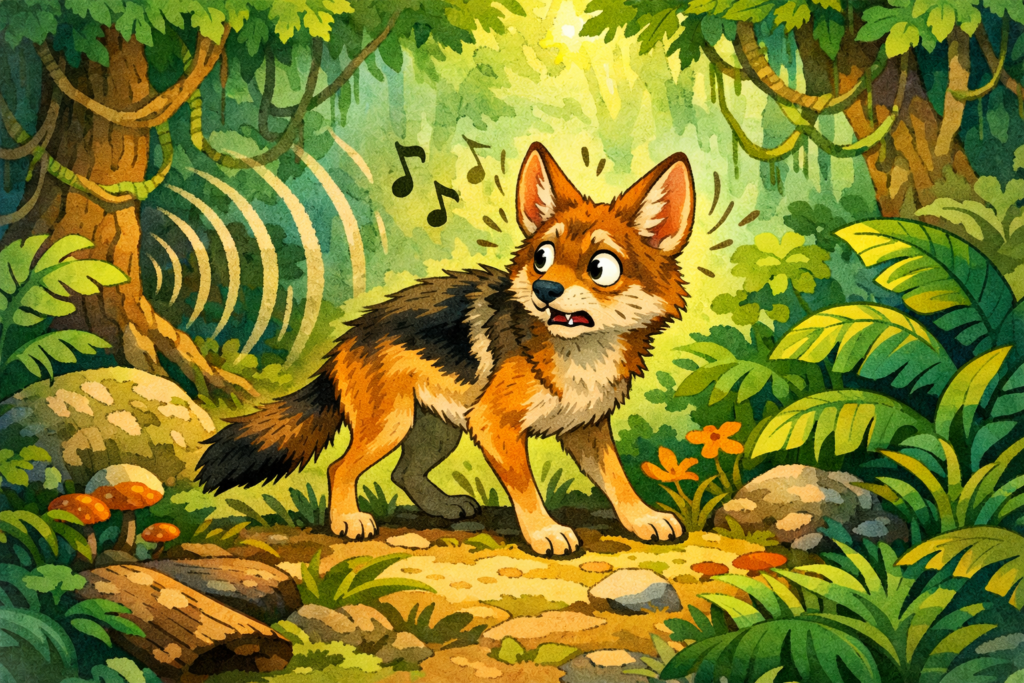 एक दिन वह खाने की तलाश में जंगल में घूम रहा था। तभी उसे एक अजीब सी आवाज सुनाई दी—“ढम-ढम… ढम-ढम…”