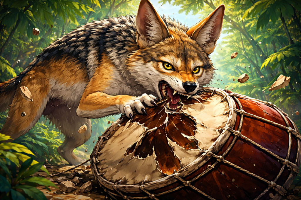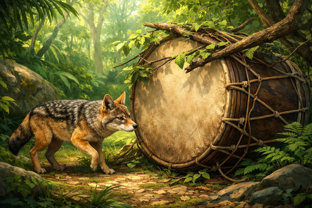 गीदड़ समझ गया कि यह कोई जानवर नहीं, बल्कि ढोल है।