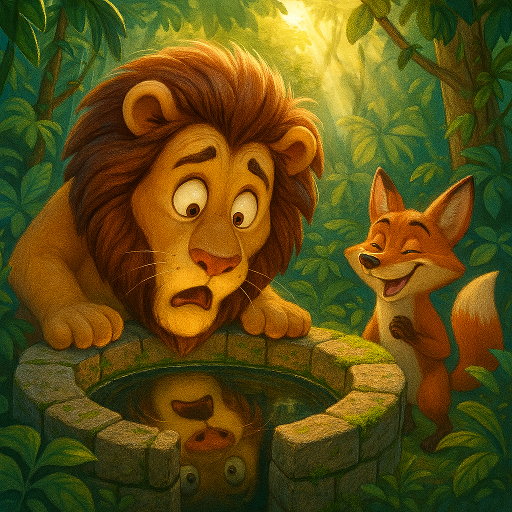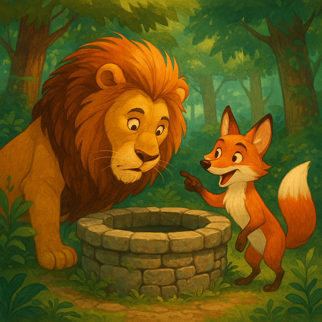 लोमड़ी ने शेर को एक गहरे कुएँ के पास ले गई, जो जंगल में बीचों-बीच था। यह कुआँ बहुत पुराना था और इसका पानी साफ था।