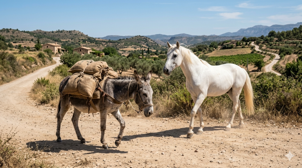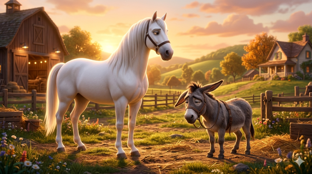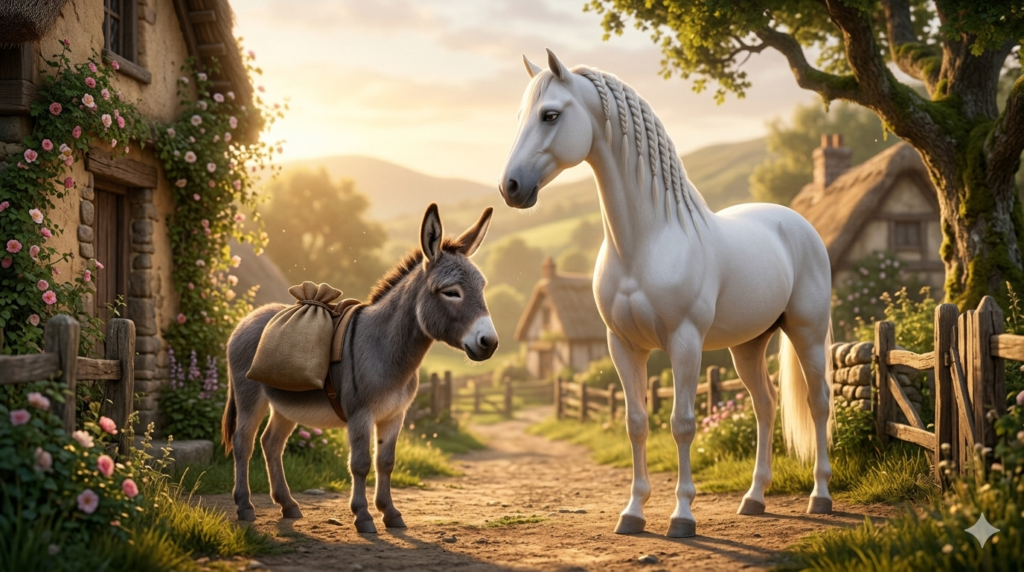 एक व्यापारी के पास एक बहुत ही सुंदर घोड़ा और एक मेहनती गधा था। घोड़ा अपनी तेज़ रफ़्तार और सुंदरता पर बहुत घमंड करता था। वह अक्सर गधे का मज़ाक उड़ाते हुए कहता, “तुम कितने बदसूरत और सुस्त हो! देखो मुझे, मैं कितना राजसी दिखता हूँ।” गधा चुपचाप अपनी मेहनत करता रहा।
