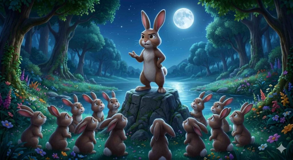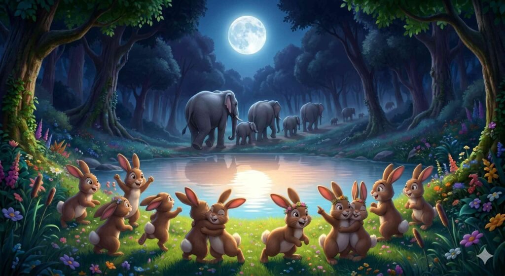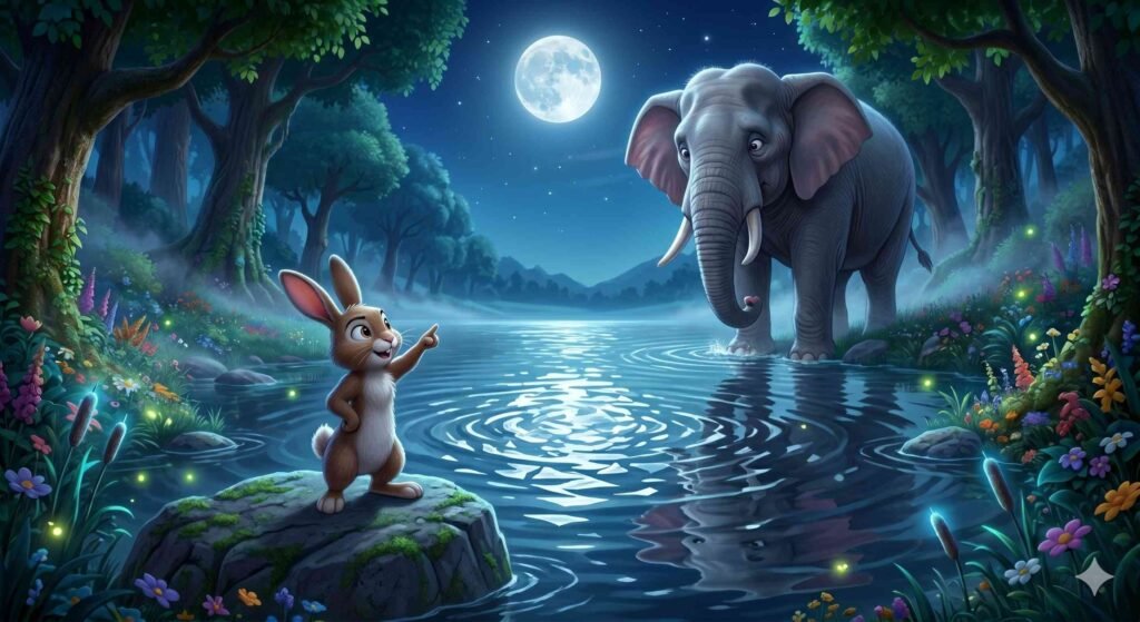 तब ‘चीकू’ नाम के एक बुद्धिमान खरगोश ने एक तरकीब सोची। पूर्णिमा की रात, जब गजराज पानी पीने आया, तो चीकू ऊंचे पत्थर पर खड़ा होकर बोला, “रुक जाओ! मैं चंदा मामा का दूत हूँ। तुमने उनके प्यारे खरगोशों को मारा है, इसलिए वे तुमसे बहुत नाराज हैं।”