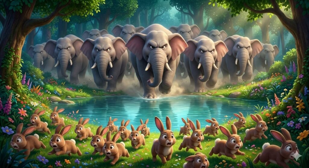 हाथियों के सरदार ‘गजराज’ और उसके झुंड ने सरोवर तक पहुँचने की जल्दी में कई खरगोशों को अपने भारी पैरों तले कुचल दिया। सभी खरगोश बहुत डरे हुए थे।