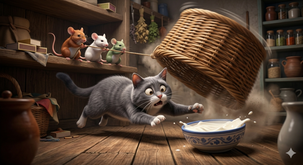 अगली सुबह, चूहों ने बिल्ली के सामने ढेर सारी मलाई और पनीर रख दिया। बिल्ली बहुत लालची थी। जैसे ही मानो बिल्ली मलाई खाने के लिए झपटी, तीनों चूहों ने एक साथ मिलकर उसके ऊपर एक बड़ा भारी टोकरा गिरा दिया। बिल्ली टोकरे के नीचे बुरी तरह फंस गई।