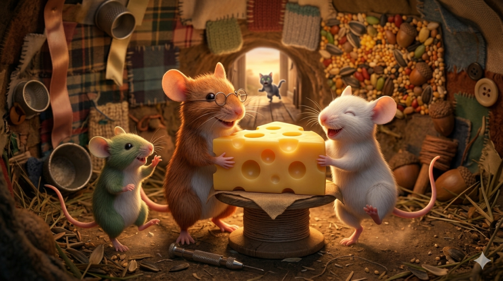 एक दिन तीनों चूहों ने मिलकर एक सभा बुलाई। सबसे छोटे चूहे ने कहा, “हमें बिल्ली के गले में घंटी बांधनी चाहिए।” हालांकि, बड़े चूहे ने मुस्कुराते हुए कहा, “नहीं! हमें घंटी की जगह एकता का इस्तेमाल करना चाहिए।” उन्होंने बिल्ली को सबक सिखाने के लिए एक चतुर योजना बनाई।