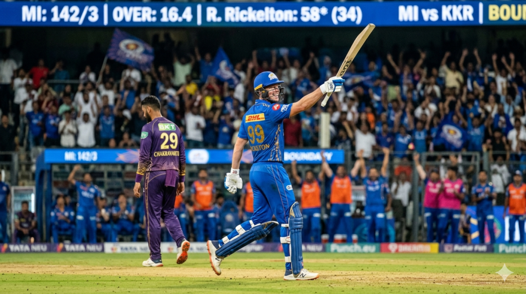 Mumbai Indians successfully pulled off one of the highest run-chases in their history, reaching 224/4 in just 19.1 overs. Despite a massive total set by KKR, the “Blue and Gold” army utilized the dew factor and a small boundary to perfection.